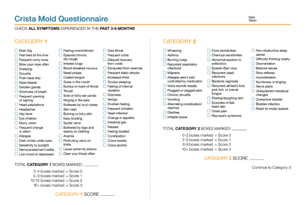 This handout includes a detailed questionnaire covering symptoms across multiple body systems (respiratory, neurological, immune, digestive, etc.), questions about your living and work environments, and a scoring system to assess your likelihood of mold-related illness. You’ll also learn about next steps if your score suggests mold may be an issue.